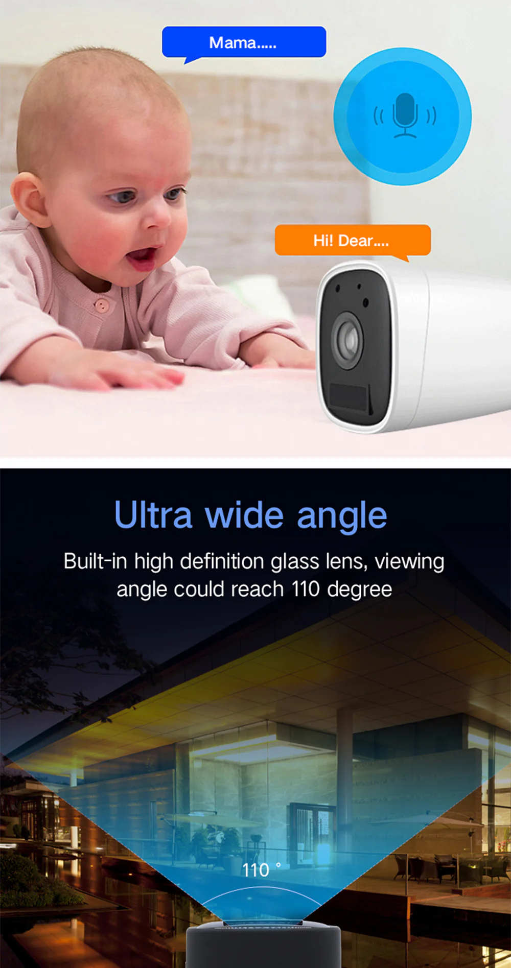 When the camera detects motion,it sounds an alsrm and sends a message to your mobile APP.